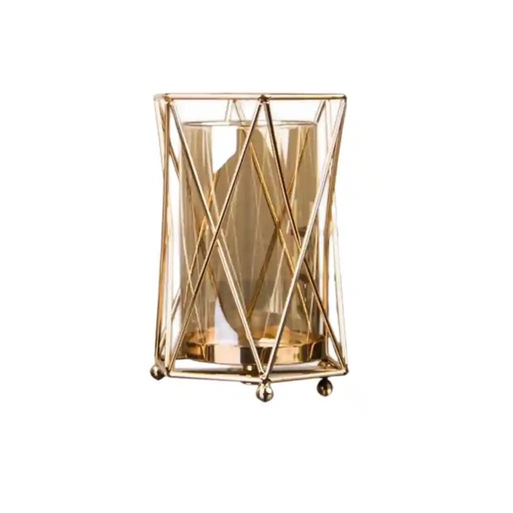 Decora tus espacios con porta vela de vidrio y metal dorado de estilo nórdico, diseño elegante ideal para mesas de arrimo, centrales, laterales, etc. Seguramente llamará la atención por su diseño simple y elegante. Diseño en metal con una base donde se sustenta la vela que se use, al interior de la estructura metálica posee un cilindro de vidrio en tono dorado, se puede usar con o sin el cilindro de vidrio. Dimensiones: Alto 19 cm, Ancho: 13 cm