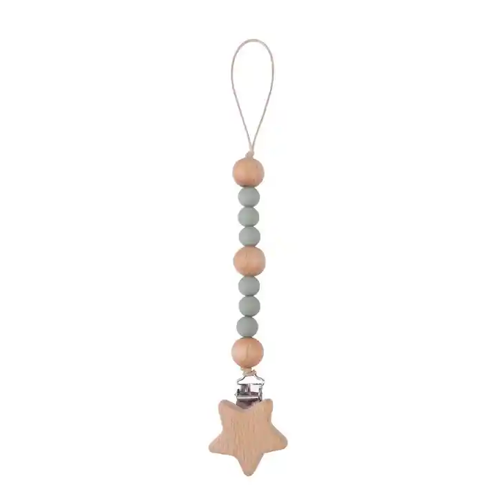 Precioso portachupete de madera con bolitas de silicona grado alimenticio.