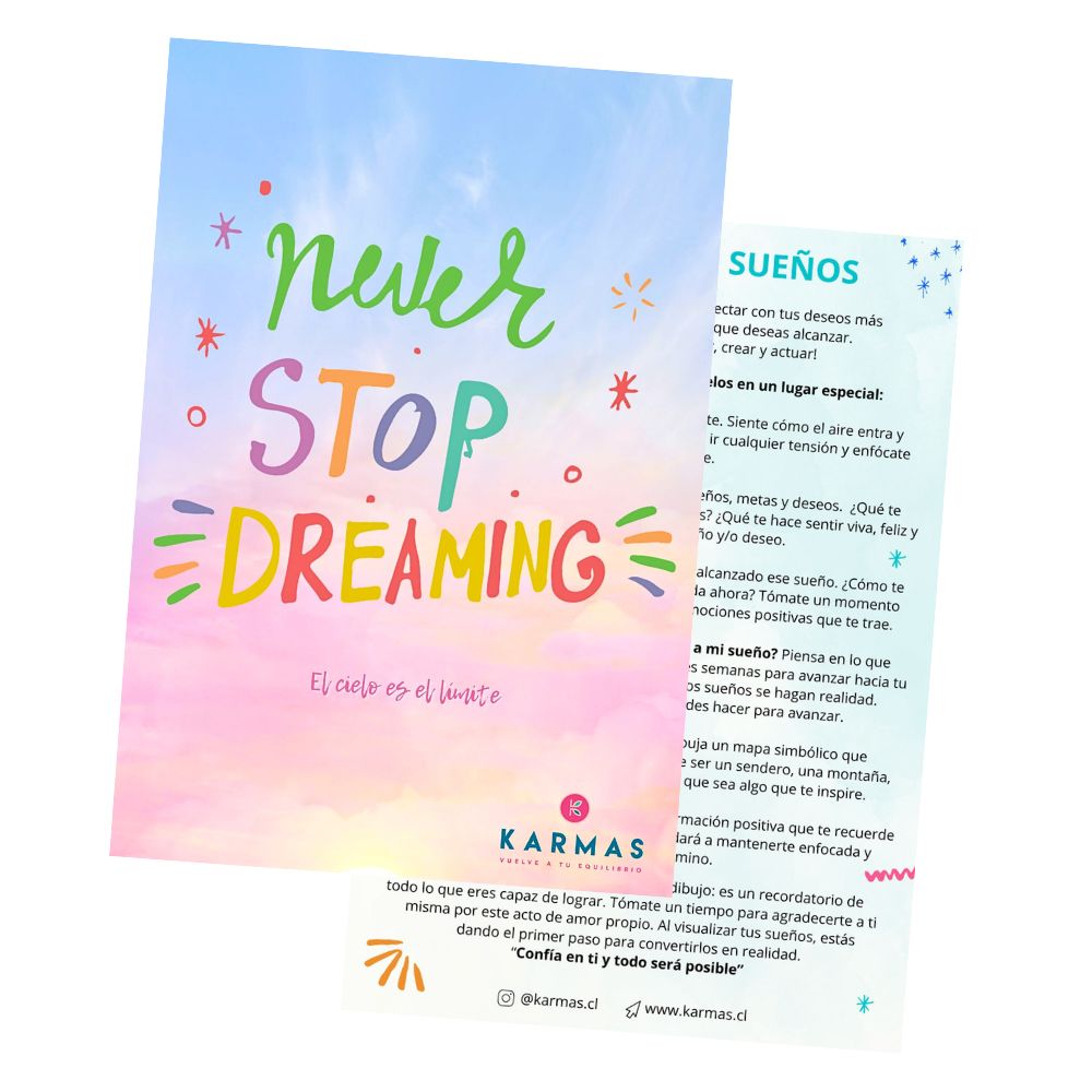 <p><span data-sheets-userformat="{"2":769,"3":{"1":0},"11":4,"12":0}" data-sheets-value="{"1":2,"2":"30 tarjetas con distintas frases motivacionales, llenas de energía positiva para tu día a día. Incluye atril para ponerlas y bolsa de algodón ecológica.\n\nSon 30 coloridas tarjetas con distintas frases motivacionales para tu día a día. Te queremos entregar esta herramienta para motivarte a practicar tu amor propio y ser amable contigo. Están diseñadas especialmente para llevar una vida más positiva y feliz. \nModo de uso: Elige cada día una tarjeta, visualízala y recuérdala a lo largo del día. ¡Con el tiempo, estas afirmaciones irán formando parte de tu vida!\nFinalmente en la noche recuerda la frase para terminar el día de la mejor manera.\nTip extra: ¡Todo está en ti!\nMedida tarjetas: 9 x 12 cms\nMedida bolsa de algodón ecológica: 14 x 19 cms\n\n* Incluyen un atril para verlas diariamente y una bolsita de algodón ecólógica, reutilizable y biodegradable para guardarlas.\n\n\n"}">¡Te queremos invitamos a creer en tus sueños y hacerlos realidad! </span></p> <p><span class="OYPEnA font-feature-liga-off font-feature-clig-off font-feature-calt-off text-decoration-none text-strikethrough-none">Diseñada para ayudarte a visualizar lo que realmente deseas para ti misma, conectar con tus sueños y dar los primeros pasos hacia ellos. Te ayudará a “dibujar” tus sueños y a hacerlos más tangibles para que finalmente, los logres!</span></p> <p><span class="OYPEnA font-feature-liga-off font-feature-clig-off font-feature-calt-off text-decoration-none text-strikethrough-none">Tómate un momento para relajarte, reflexionar y escribir. ¡Este es tu espacio para soñar y creer en ti!</span></p> <p> </p> <p>Medida: 11 x 16</p> <p> </p> <p class="p1">Preparamos cada producto Karmas en un precioso packaging con cintas de colores y lleno de detalles en su interior, para sorprender a tus más queridos o a ti misma.</p>