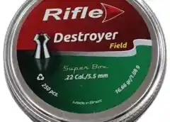 Postón Rifle 5,5 Destroyer 250u / Postón para rifle a postón / Marca Rifle / Modelo Destroyer / Tipo punta hueca con puntita central / Manto liso / Calibre 5,5 (.22mm) / Microcalibrados / Peso 1,08 grs (+/- 0.02 grs) / Grains 16,66 / Tamaño 7,60 mm (+/-0,02 mm) / Postón de peso mediano / Material plomo / Color plomo / Campo de aplicación optimo: 25 metros / Envase lata con 250 Postones / Peso de la lata 294 grs / Producto de Brasil