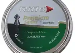 Postón Rifle 5,5 Pointed 250u / Postón para rifle a postón / Marca Rifle / Modelo Pointed Premium / Tipo punta / Manto liso / Calibre 5,5 (.22mm) / Microcalibrados / Peso 1,29 grs (+/- 0.02 grs) / Grains 19,99 / Tamaño 9 mm (+/-0,2 mm) / Postón pesado / Material plomo / Color plomo / Campo de aplicación optimo: 25 metros / Envase lata con 250 Postones / Peso de la lata 345 grs / Producto de Brasil