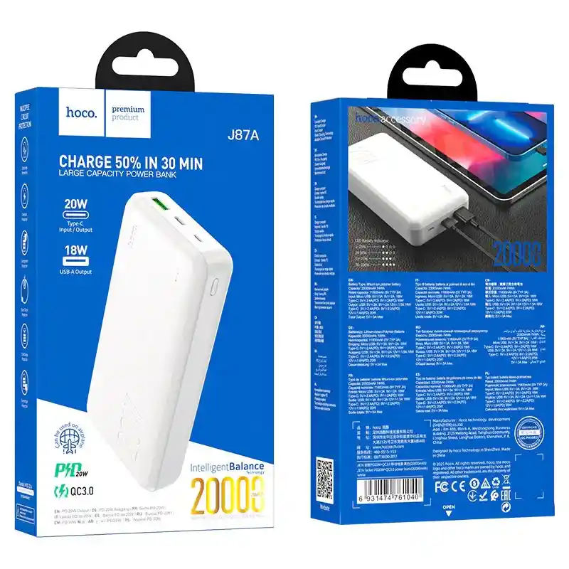 Power Bank Móvil 20.000 Mah Carga Rapida 20w Blanco Hoco Premium