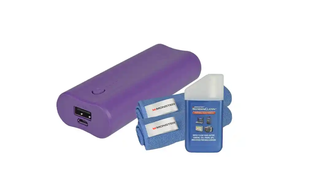 Descripción Powerbank: Carga tus dispositivos como, iPhone, iPad, Tablet u otros. Especificaciones: Color: Púrpura Banco de potencia inteligente con capacidad de 4400 mAh Un (1) puerto USB tipo A de 2.4 A Entrada micro USB tipo B Botón de encendido Luces indicadoras LED Componentes sin plomo (compatible con RoHS) Tipo de batería: iones de litio Capacidad: 3.7V, 4400mAh, 16.28Wh Entrada micro USB: 5V — 2A Salida USB: 5V — 2.4A Dimensiones de la unidad: 10 cm de largo, 4 cm de ancho y 2 de alto Descripción kit limpieza: Full protección para Smartphone, Tablet y pantallas Con CleanTouch 2.0, protege su pantalla con una capa micro delgada de protección que repele las bacterias, la suciedad, el polvo y las huellas digitales. También protege contra la adhesión microbiana. Este producto está patentado y es de origen EEUU. Se incluyen dos toallas de microfibra antibacterial, la manera perfecta de limpiar suavemente y con seguridad. ¡Haz que tu pantalla recién limpia, permanezca prístina por más tiempo con Monster CleanTouch 2.0! Especificaciones: La pantalla de un smartphone puede tener hasta 30 veces más cantidad de bacterias que la tapa de un inodoro, según un estudio realizado por la Universidad de Barcelona¨. Los polímeros patentados protegen de agentes microbianos, huellas dactilares, polvo y suciedad. botella de (180ml) con spray de pulverización. Protege contra adhesión microbiana. Extiende en tiempo de limpieza de tus pantallas. Incluye dos (2) toallas de microfibra antibacteriales. Especial para llevar en tu bolso o mochila.