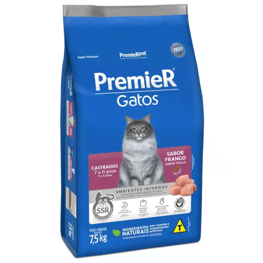 PremieR® Gatos Castrados 7 a 11 años – Pollo es un alimento Super Premium que es parte de la línea PremieR® Gatos Castrados, una línea de alimentos especialmente desarrollada para garantizar el máximo en salud y vitalidad a los gatos a través de cuidados nutricionales específicos tras la castración. Con foco en promover el mantenimiento del peso ideal y la salud del tracto urinario en los gatos castrados, estos alimentos se presentan divididos por franja etaria, ya que tanto el peso como la incidencia de los cálculos urinarios varía en función de la edad. Esta forma de presentación garantiza una alta precisión en los beneficios ofrecidos y permite agregar cuidados generales inherentes a cada fase de la vida.