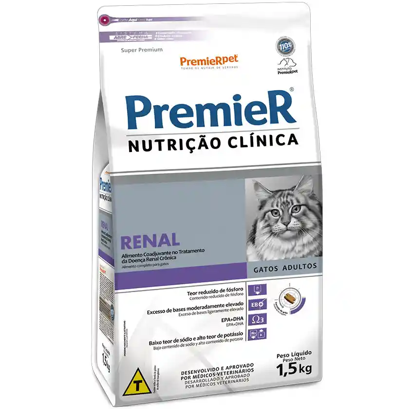 PremieR Nutrición Clínica Gatos Renal es un alimento premium para gatos que ayuda a tratar la enfermedad renal crónica, minimiza los síntomas y previene la formación de cálculos urinarios. Es importante utilizarlo de acuerdo con la prescripción del veterinario y como el único alimento de por vida para los gatos con esta enfermedad. Además, algunos cambios en la alimentación pueden ser beneficiosos para los pacientes con enfermedad renal crónica. Beneficios: Contenido reducido de fósforo: Los niveles reducidos de fósforo minimizan la progresión de la enfermedad renal y la hiperfosfatemia generalmente asociada. Exceso de bases moderadamente elevado: Prevención de la acidosis metabólica y de urolitos de oxalato de calcio por medio del equilibrio catiónico de la dieta. EPA+DHA: Los ácidos grasos esenciales de la familia Omega 3 (EPA + DHA) ayudan a mejorar la perfusión renal y a reducir los eicosanoides proinflamatorios, disminuyendo la progresión de la enfermedad renal. Bajo en sodio y alto en potasio: Minimiza la hipertensión glomerular mediante la restricción de sodio y previene la hipocalemia gracias a la presencia de altos niveles de potasio
