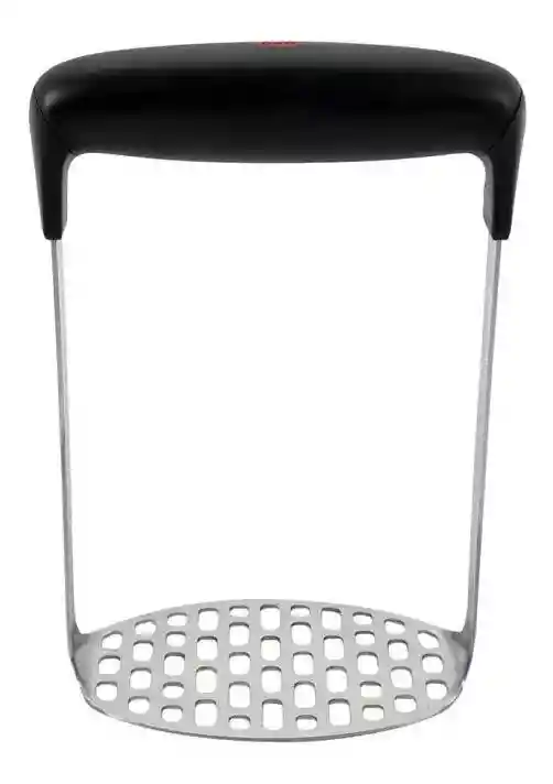 Prensa Papas está diseñado para moler tus papas fácilmente sin dañar tus manos. Tiene un mango blando y un cabezal amplio de acero inoxidable. Presiona hacia abajo para moler papas, camotes, frutas, verduras o lo que necesites! Apto para lavavajillas.