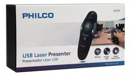 · Presentador de diapositivas y puntero láser · Botón iniciar presentación · Botón pantalla en blanco · Botón Navegación de ventanas · Compatible con PC y Mac · Pila incluida Micro Receptor.