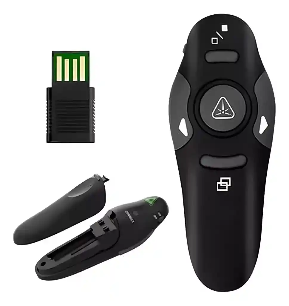 Puntero láser USB inalámbrico: dispositivo de clic remoto con tecnología avanzada para apoyar presentaciones de PowerPoint y Slideshow. Funcionalidad completa – Clicker para presentaciones de portátiles con herramientas esenciales para una ejecución fluida: Conectar, página siguiente/anterior, pantalla oscura, botones láser y de escape. Diseño ergonómico y elegante: forma delgada que promueve la comodidad y previene la fatiga; tamaño compacto con ranura de receptor USB para fácil transporte. Luz láser de alta visibilidad: emite un haz rojo brillante visible contra la mayoría de fondos y superficies proyectivas. Rango de operación de hasta 30 pies permite al usuario moverse libremente e interactuar con la audiencia. Características: - Potencia de emisión láser: 0.5 mw - Tasa de Voltaje/corriente: DC 3V / 35 mA. - Distancia Láser: 200 mtrs. - Distancia de Control: 30 mtrs. - Radio frecuencia: 2.4 GHz - Sistemas operativos compatibles: Windows 10, macOS 10.13, Linux - Fuente de alimentación: batería de 1 x AAA (No Incluida) - Tipo de interruptor: Palanca - Material: Plástico - Color: Negro - Modelo: 00300 - Marca: Philco