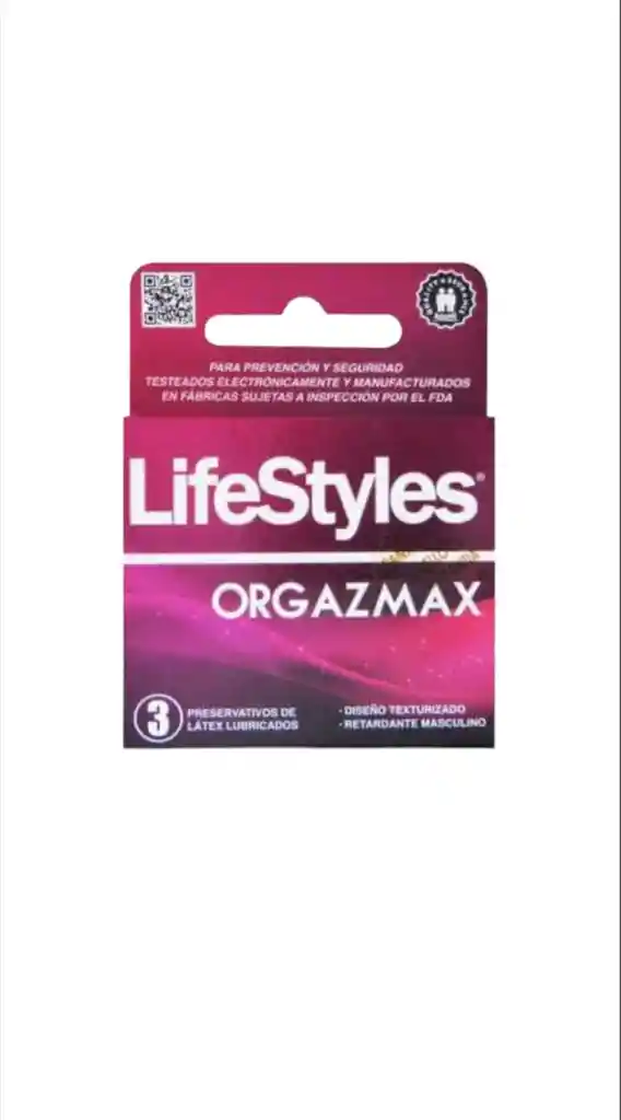 LifeStyles Orgazmax es un preservativo de látex lubricado con retardante masculino lo cual ayuda a retardar la eyaculación sin perder la sensibilidad. Además posee una superficie texturada con micro gránulos en relieve para una mayor estimulación a la pareja.. Lubricado con retardante masculino (benzocaína al 4.5%) Características: Preservativo con retardante masculino y texturado. Material: Látex Color: Transparente Contenido: 3 unidades No reutilizables