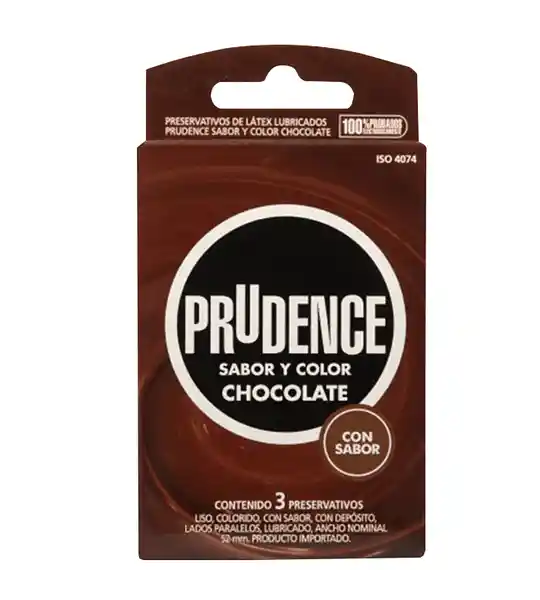 Prudence, la marca #1 de preservativos en latino América Latina, llegó con su látex de primera calidad. El Preservativo Prudence Chocolate es un preservativo liso, con depósito y lubricado para que puedas tomar precauciones y evitar enfermedades de transmisión sexual y embarazos no deseados. Además con un exquisito sabor y aroma a chocolate que le brindará una sensación rica y novedosa a tus encuentros. Características: Material: látex Tipo: Chocolate Contiene 3 unidades Largo mayor 180 mm Ancho 56 mm +/- 2mm Grosor 0.065 +/- 0.15 mm Observaciones Revisar componentes para evitar reacciones alérgicas En caso de irritación suspender y consultar a su médico Recomendaciones La eficacia del preservativo dependerá de su uso correcto, no dejar en el calor, humedad o luz directa.