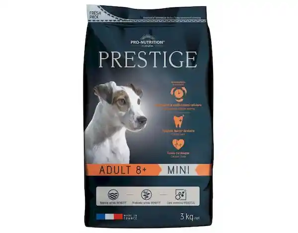 Flatazor Trade Prestige Adult Mini 8+ es un Alimento Completo Para Perros Adultos de Cualquier Raza Pero de Tamaño Mini de Más de 8 Años Está Enfocado en Las Principales Necesidades Que Tienen Perros en Edad Senior Contribuye al Mantenimiento de Una Buena Salud Cardiovascular y a la Lucha Contra el Envejecimiento Celular. Además Cuenta Con Ingredientes Hiper Digeribles Que Hacen Que se Garantice un Buen Tránsito Intestinal le Darás un Alimento de Calidad Que Mantendrá su Paladar Feliz y un Equilibrio Óptimo de Proteínas/Energía. Cada Fórmula Prestige Está Pensada Para Ofrecer al Perro Una Alimentación Nutricional Óptima Perfectamente Equilibrada y Extremadamente Apetecible Para Cubrir Todas Sus Necesidades Sea Cual Sea su Estado de Salud y Fisiología Además de Garantizar Que la Comida Diaria Sea un Verdadero Placer. La Fórmula de la Gama Prestige no Contiene Colorantes Artificiales ni Organismos Genéticamente Modificados en Las Materias Primas Vegetales Sino Ingredientes Diversos de Muy Alta Calidad Hiper Digeribles y Específicamente Seleccionados Por Sus Propiedades Para el Organismo. Los Alimentos Prestige Integran Fibras de Manzana y Son Ricos en Polifenoles y Antioxidantes Naturales Para Ofrecer Una Protección Idónea de Las Células Del Organismo Fructooligosacáridos Para Una Digestión Óptima y Semillas de Lino Ricas en Omega 3 Para Una Piel Sana y un Pelaje Sedoso.