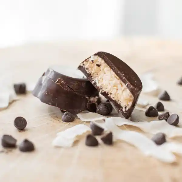 caja con 6 bombones elaborados con chocolate al 65% y rellenos con una combinación de coco y leche condensada de coco, producto libre de gluten, vegano, libre de soya.