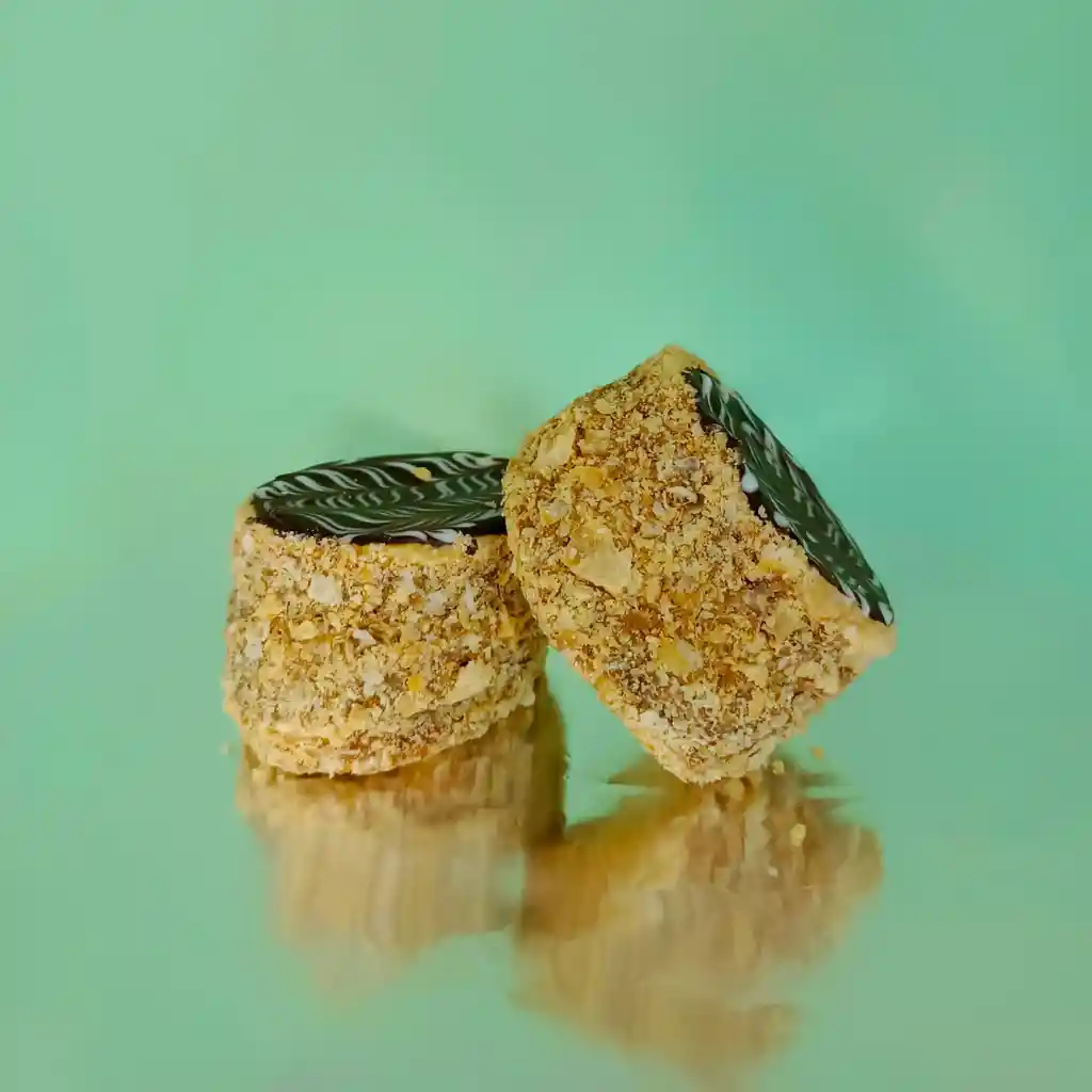 Alfajor de mil hojas relleno de manjar, crema y mermelada de frambuesa; recubierto con una fina capa de chocolate