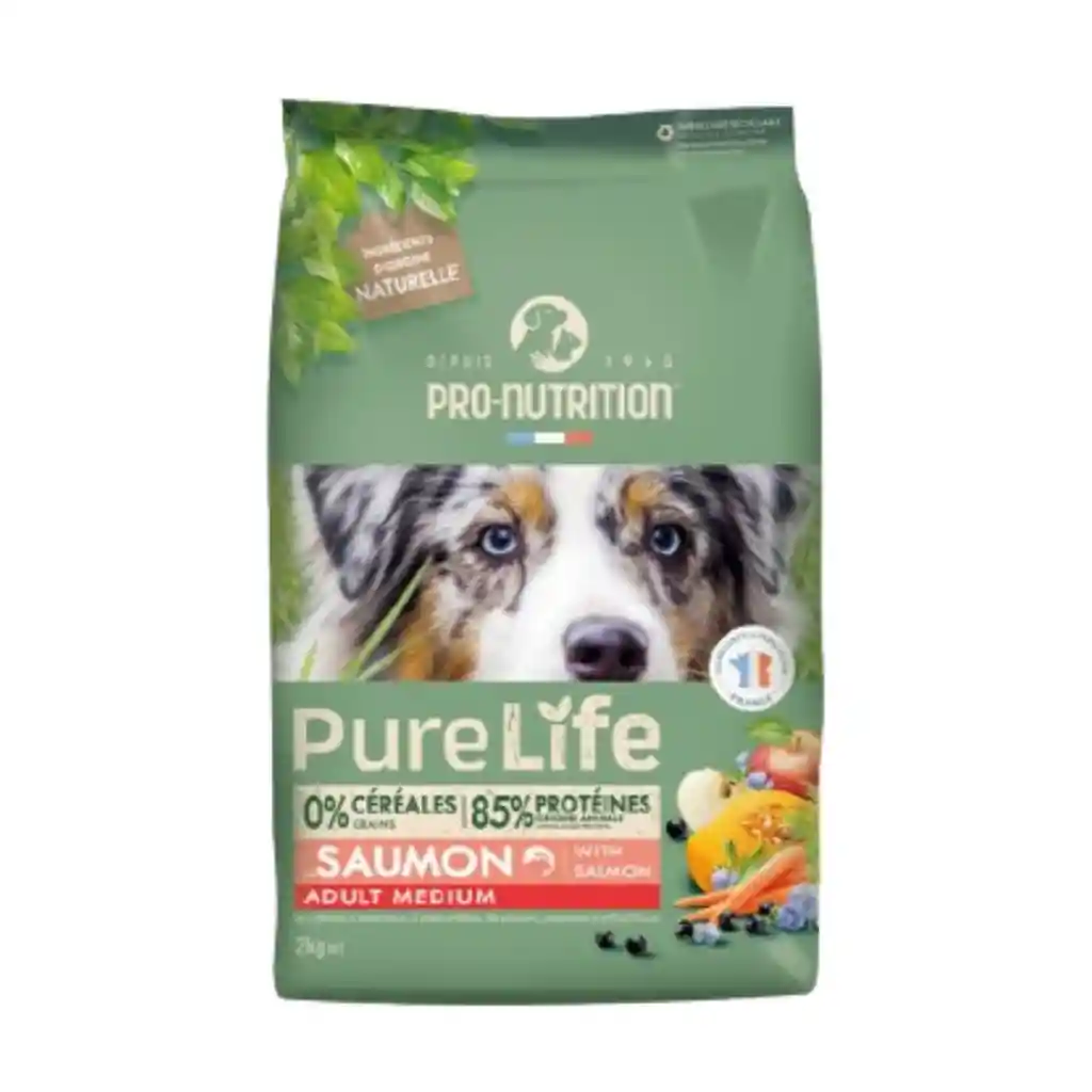 Alimento completo sin granos y sin gluten, específicamente formulado para cubrir las necesidades de los perros adultos de razas medianas. Edad: Adulto. Peso: Entre 10kg y 25kg. BENEFICIOS: PIEL SANA Y PELAJE SEDOSO Gracias a la combinación de biotina, zinc quelatado y un aporte óptimo de omega 6 / omega 3, nuestras croquetas Pure Life Adult Medium con Salmón satisface las necesidades nutricionales específicas de los perros adultos de tamaño mediano, además promueve una piel sana y un pelaje sedoso. INGREDIENTES Proteínas animales deshidratadas 28% (pollo, pavo, cerdo). Fécula de patata. Grasa animal (pavo, cerdo). Almidón de guisantes. Fibras de manzana*. Guisantes*. Patata dulce*. Proteínas deshidratadas de salmón (4%). Linaza*. Fibras de haba*. Hidrolizado de proteínas animales. Aceite de colza. Levadura de cerveza. Alcachofa*. Autolisados de pescado* (0,5%). Zanahorias deshidratadas*. Aceite de pescado. Sal de mar. Fructooligosacáridos. Hinojo*. Algas*. Calabaza*. Cranberry*. Cassis*. Granada*. Extractos de levadura (Saccharomyces cerevisiae, Ciberlindera Jadini). Acerola*. Espino amarillo*. Arándano*. Melón*. Vitaminas y oligoelementos. * Ingredientes de origen natural. CONTENIDO: 2 Kg.