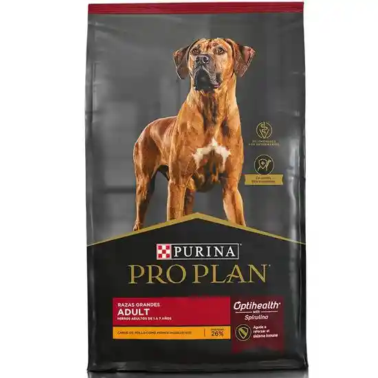 Pro Plan Adulto OptiHealth, en formato de 15 kgs., es un alimento para perros de razas grandes que ofrece una nutrición avanzada para satisfacer las necesidades nutricionales de los perros adultos en razas grandes, con niveles óptimos de proteínas y grasas, y tamaño de croqueta más grande. Este alimento ha sido formulado con la tecnología OptiHealth que ayuda a fortalecer el sistema inmune y digestivo. Pro Plan Adulto OptiHealth ha sido elaborado principalmente con pollo, que es una fuente de proteínas de calidad, que son altamente digestible y presentan alto valor biológico Características Alimento para perros adultos Para perros de razas grandes Formulado con pollo Refuerza el sistema inmune Fortalece la microflora intestinal Refuerza a barrera cutánea Tamaño 12Kilogramos