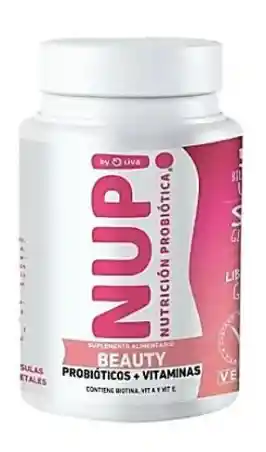 NUP! BEAUTY PROBIOTICOS + VITAMINAS Y MINERALES BELLEZA Y DIGESTION CON 1 CAPSULA AL DIA Apto para celiacos, veganos e intolerantes a la lactosa y para mayores de 8 años. Probiótico fortalecido con vitaminas y minerales ideal para mejorar tu salud corporal, fomentar la belleza de la piel y proteger el sistema inmune contra agentes patógenos. - Ideal para pieles inflamadas, sensibles, con acné, rosácea, psoriasis y dermatitis atópica en conjunto con el tratamiento médico adecuado. - Es el mejor aliado para el bodycare. BELLEZA: - Combate el envejecimiento de las células de la piel. - Favorece la hidratación y reparación de la piel (sol, radicación) - Retiene la caída de cabello y acelera el crecimiento. - Mejora la firmeza y grosor de la uñas DIGESTIVO: - Mantiene el equilibrio de la microbiota intestinal. - Mejora el transito intestinal - Reduce los síntomas relacionados con la intolerancia a la lactosa - Favorece el tratamiento de trastornos gastrointestinales Contenido: 30 Cápsulas Dosis: 1 cápsula al día.