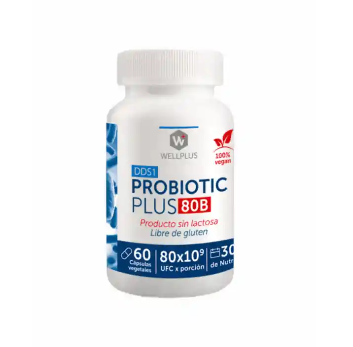PROBIOTIC PLUS 80B 60 CÁPSULAS Máxima potencia y alta eficacia. Potencia sistema inmunitario y favorece la salud intestinal. Los probióticos tienen muchas funciones en el cuerpo humano, son bacterias “amistosas” que habitan el intestino. Ayudan a establecer un sistema gastrointestinal saludable, promueven la inmunidad, y son esenciales para mantener el equilibrio de la flora intestinal. Mejoran la salud del colon y ayudan a la absorción de los nutrientes que ingerimos a través de los alimentos. Algunos de los grupos de probióticos o “bacterias buenas”, los lactobacilos y las bifdobacterias, producen inhibidores naturales tales como bacteriocinas, peróxidos y ácidos orgánicos, los cuales evitan la proliferación de bacterias indeseables. Ventajas de Probióticos WellPlus Tenemos la cepa más estudiada del mundo. Nuestros probióticos han sido testeados rigurosa y científicamente. Nuestra cepa, la DDS-1 Lactobacillus Acidophilus, es la cepa con la cual se han hecho mayor cantidad de estudios. Combinación de cepas. Nuestros probióticos no tienen más de cuatro cepas. Elegimos las idóneas y las combinamos para que se potencien y no compitan entre ellas. En probióticos no siempre más es mejor. Resistencia a los jugos gástricos. Además de la probada resistencia de la cepa DDS-1 a las sales biliares y los jugos gástricos, maximizamos su potencia en el intestino ya que utilizamos capsulas vegetarianas orgánicas diseñadas para resistir los ácidos digestivos, protegiendo los microrganismos y liberando toda la potencia de los Probióticos directo en el intestino, justo dónde tú los necesitas Ingredientes: mezcla de probioticos, l rhamnosus GG, l Acidophilus DDS-1, B lactis BI04, capsula de gelatina vegetal.