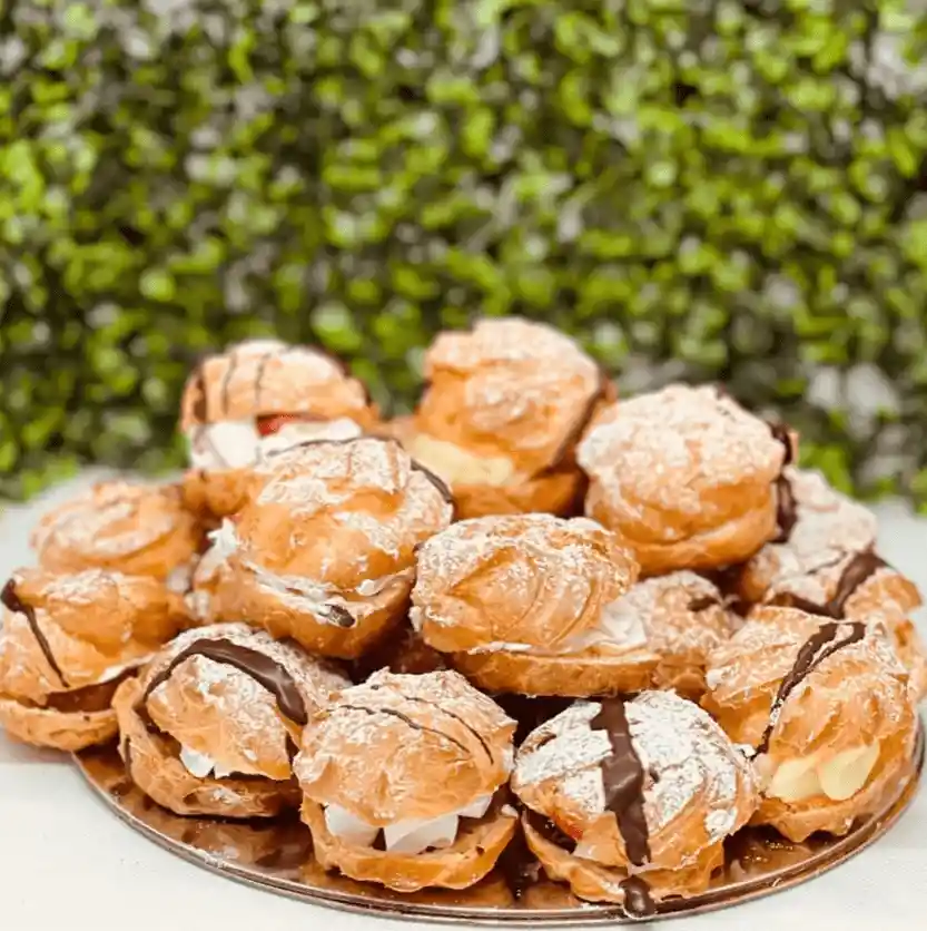 Los pioneros de la Pastelería, incluye 20 profiteroles rellenos de crema chantillí, manjar, mermelada de frambuesas y crema pastelera.