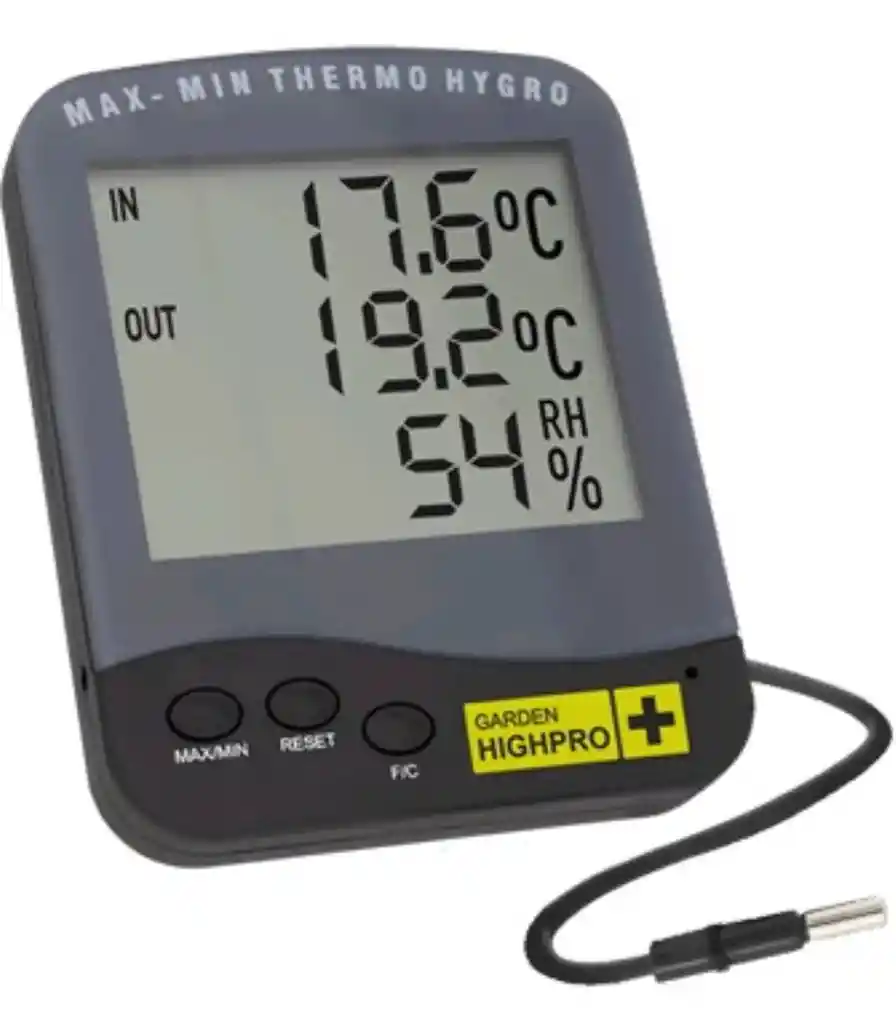 Asegura las condiciones ideales para el desarrollo de tus plantas con el ProHygro Premium de Garden Highpro, el aliado perfecto para cultivadores exigentes que buscan un monitoreo ambiental riguroso. Este termómetro e higrómetro digital ofrece mediciones precisas de temperatura y humedad, fundamentales para mantener la estabilidad del microclima en tu indoor.