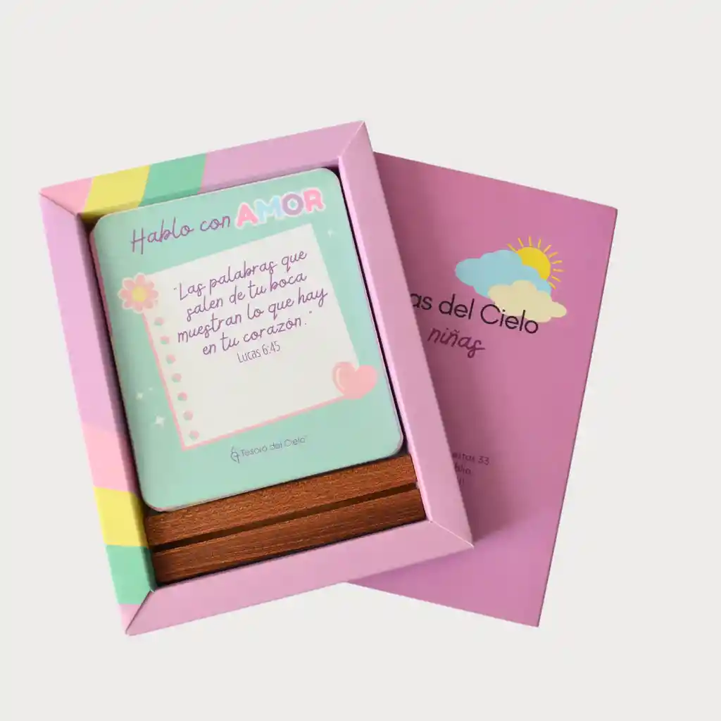 Este set es un hermoso y significativo regalo para celebrar la Primera Comunión, cumpleaños, Navidad o para expresar amor en cualquier momento a una niña especial. Cada tarjeta en este set contiene una afirmación positiva basada en un versículo de la Biblia. Estas afirmaciones son un rayito de sol que ilumina el camino de cada niña, recordándole diariamente lo valiosa y amada que es para Dios. El fundamento bíblico de estas afirmaciones garantiza que sean más que simples palabras; son semillas de sabiduría plantadas en el corazón de una pequeña hija de Dios. Al leer una tarjeta cada día, las niñas podrán reflexionar sobre cómo las ve Dios, entender Sus deseos para sus vidas y aprender las enseñanzas que las guiarán hacia una vida bendecida y en armonía con los demás. Incluye: 33 tarjetas impresas en papel couché, de 11 cm x 13cm. Soporte de madera para colocar una tarjeta en un lugar especial de su habitación.