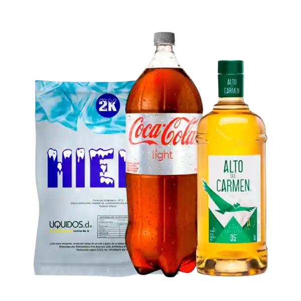 Promo de PISCO ALTO DEL CARMEN 1 LITRO + BEBIDA COCA COLA 3 LITROS + BOLSA DE HIELO DE 2 KG.