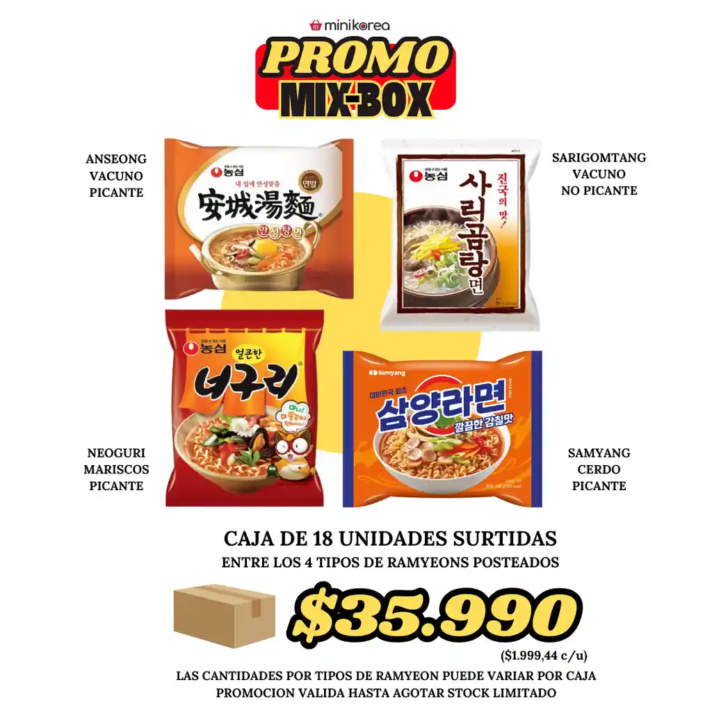 PROMOCION EN CAJA CERRADA DE 18 UNIDADES DE RAMYEON SURTIDAS ENTRE ANSEONGTANGMYEON, NEOGURI ORIGINAL, SAMYANG RAMYEON Y SARIGOMTANG. SE COMERCIALIZA SOLAMENTE EN CAJA CERRADA Y LAS CANTIDADES PUEDEN VARIAR POR CAJA.