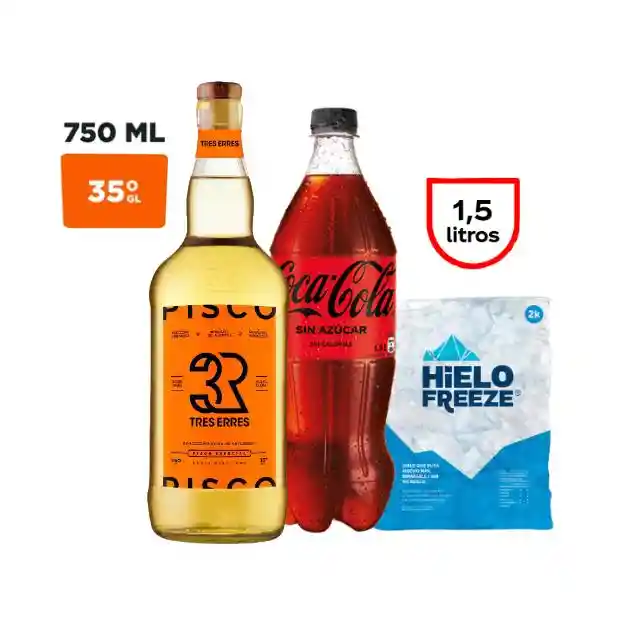 PROMO PISCO TRES ERRES 750CC + COCA ZERO 1.5 L + HIELO 2K