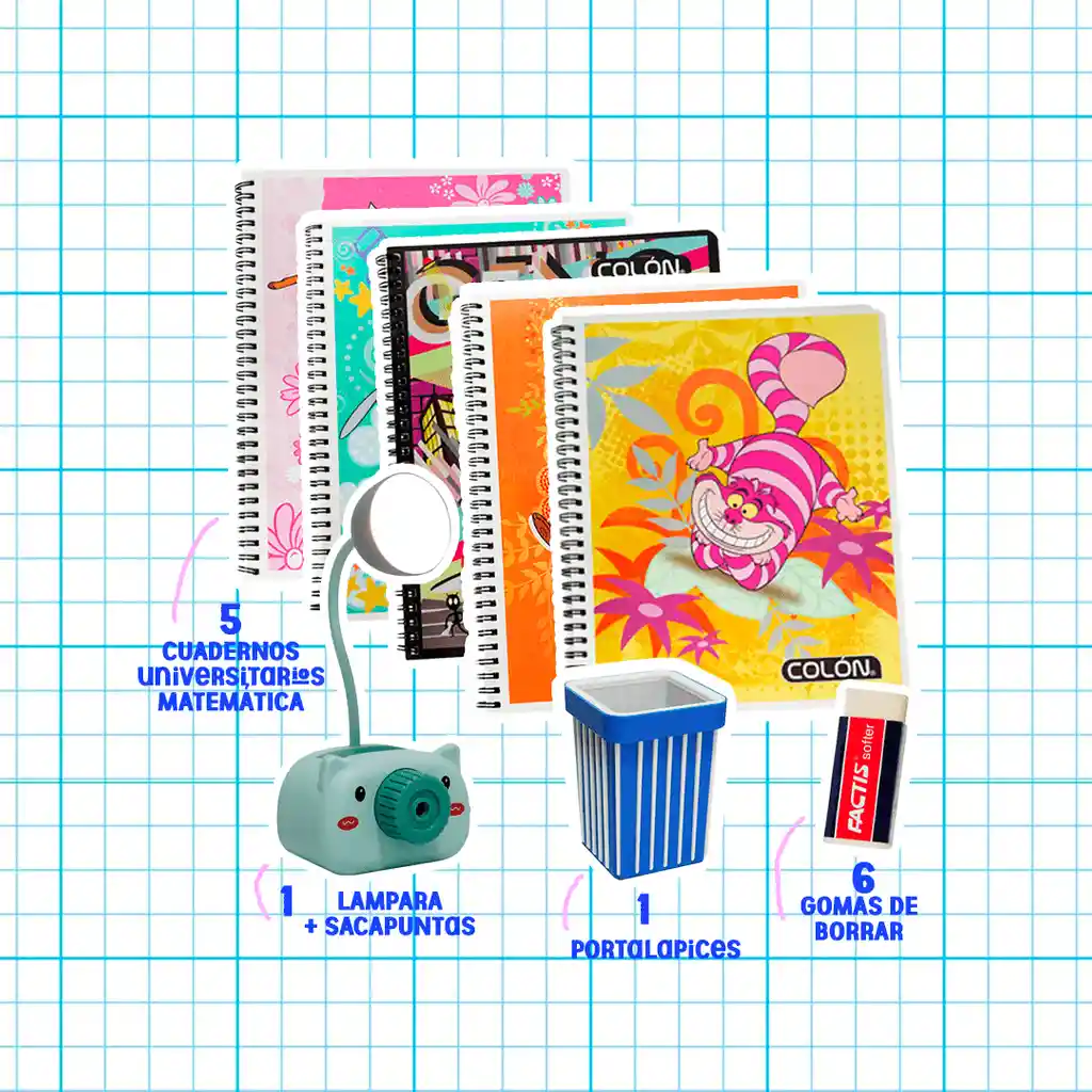 5 Cuaderno de matemática 100hjs 6 Gomas 1 Lampara sacapunta 1 Porta lápices 100 hojas interiores en suave papel ultra ecológico. Es un precioso regalo. Hermosa y fino cuaderno de tapa dura con diseño. Modelo: matemática