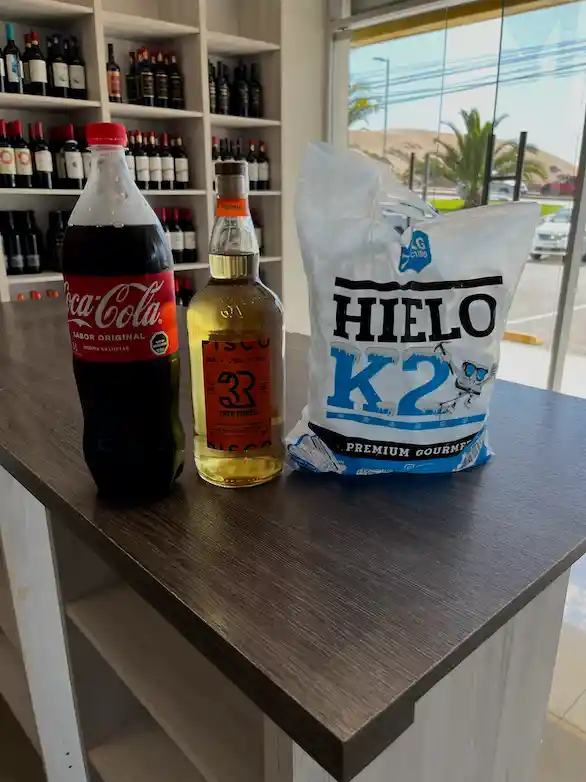 Promoción de un pisco de 1L 3R 35°, Hileo 2 kilos y Coca Cola 1.5 litros