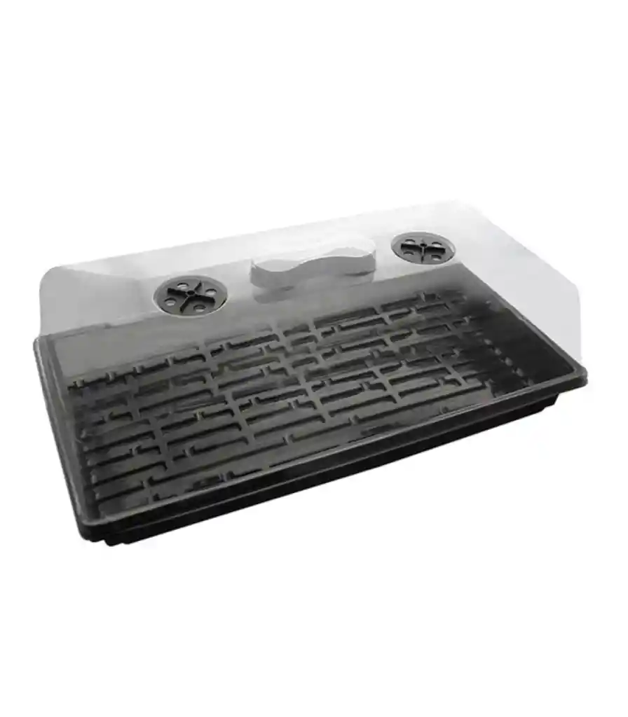 Propagador para Esquejes y Semillas Cúpula de propagación con orificios de ventilación ajustables. Aumenta la humedad para una germinación más rápida y efectiva. Ideal para esquejes y semillas. Medidas: 54,1 x 27,9 x 25,4 cm. El Propagador para Esquejes y Germinación de Semillas es la herramienta esencial para cualquier cultivador que busque maximizar sus tasas de éxito en la propagación. Diseñado con una cúpula de gran altura y laterales verticales rectos, permite utilizar de forma eficiente todos los espacios disponibles en la bandeja, haciendo que cada sitio de cultivo cuente. Este propagador crea un ambiente controlado con alta humedad, ideal para acelerar la germinación de semillas y el enraizamiento de esquejes. Sus dos orificios de ventilación superiores se pueden abrir o cerrar según la necesidad, facilitando el ajuste preciso de la humedad y la temperatura interna. Esto favorece un desarrollo saludable desde las primeras etapas del cultivo. Características técnicas: Dimensiones internas: 54,1 x 27,9 x 25,4 cm Uso recomendado: Propagación de semillas, esquejes y otros métodos de clonación Cúpula alta y transparente: Permite el paso de luz y suficiente espacio para el crecimiento inicial Ventilación regulable: Mejora el control del microclima Diseño optimizado: Laterales rectos que aprovechan toda la superficie de la bandeja Ideal para cultivadores principiantes y experimentados que buscan acelerar la germinación, reducir el estrés en esquejes y mantener un entorno estable en las fases más delicadas del cultivo.
