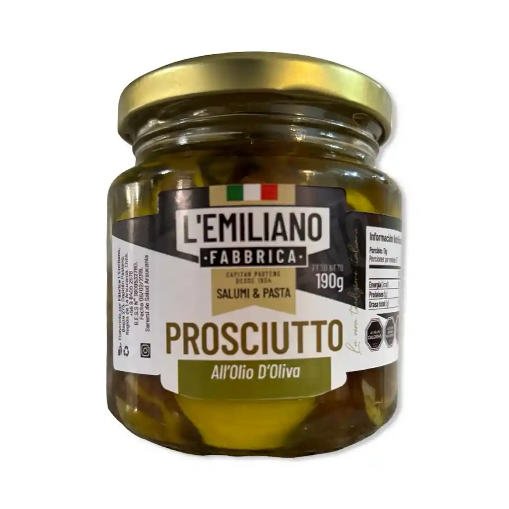Elaboración artesanal, finas laminas de prosciutto maceradas en aceite de oliva con laurel, ajo y pimienta negra entera, producto de Capitán Pastene.