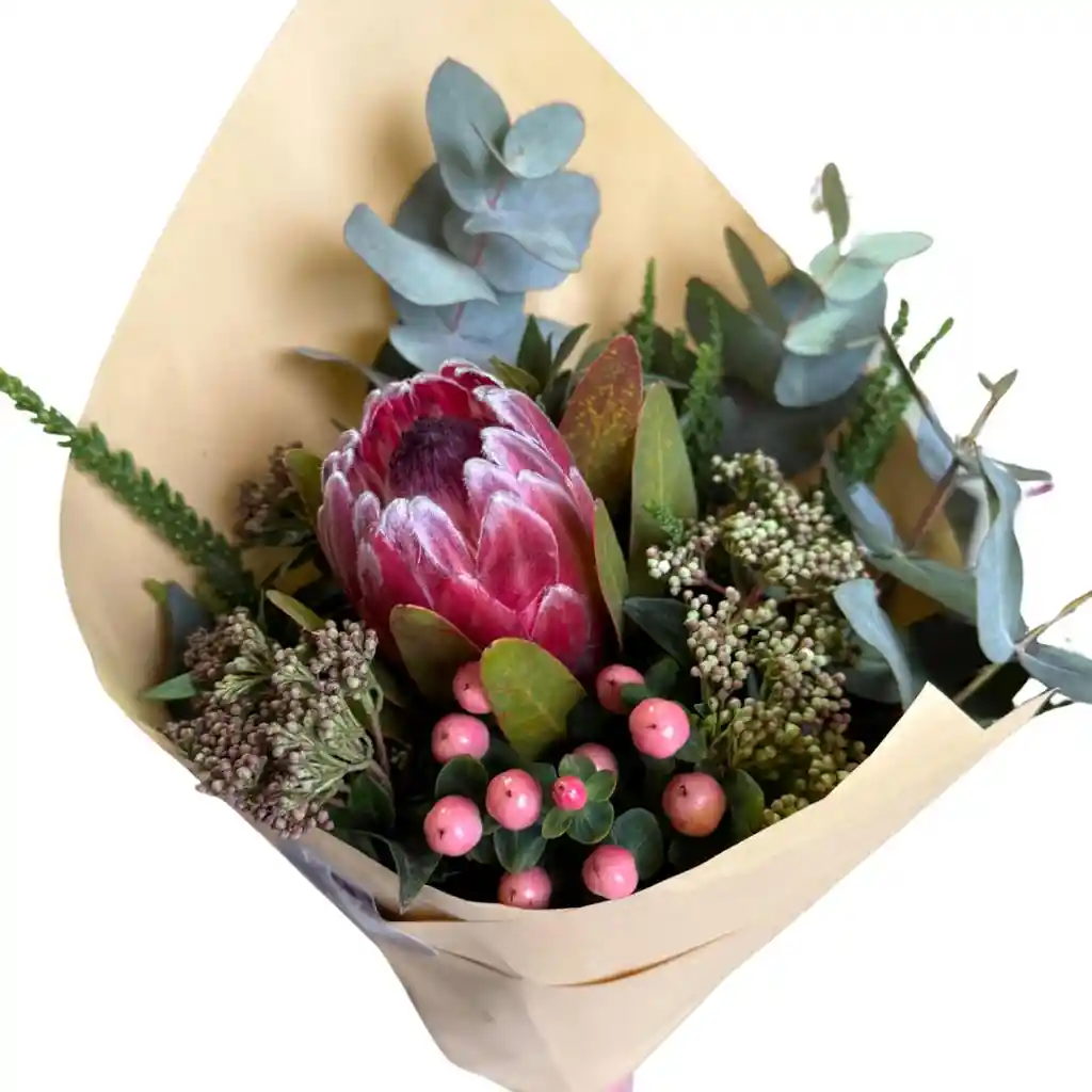 Ramo de protea con mix de follajes, envuelto en paqpel kraft.