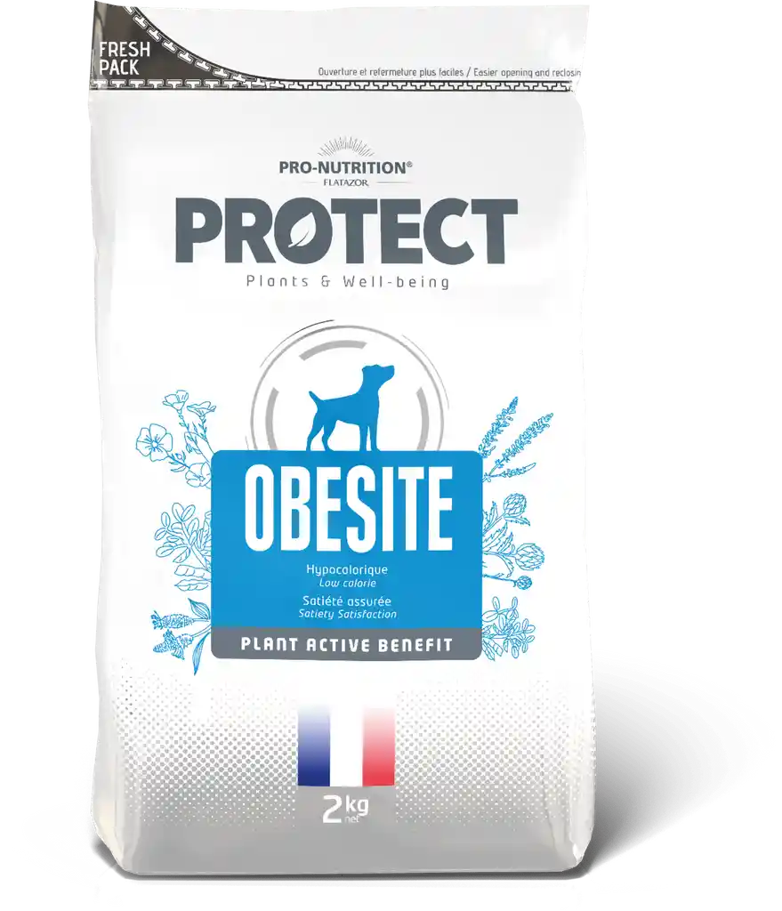 Protect Obesite es un alimento dietético para perros con objetivos nutricionales específicos,. Ingredientes activos naturales de origen vegetal ayudan a la pérdida de masa grasa conservando la masa muscular, una reducción en la sensación de hambre, el bienestar digestivo y una buena salud del hígado. INDICACIONES: Reducción del exceso de peso y a la regulación del aporte de glucosa (Diabetes Mellitus). PRINCIPAL ORIGEN DE PROTEÍNA: Pollo PRINCIPAL ORIGEN DE CARBOHIDRATO: Maíz LIBRE DE: Colorantes y Conservantes FABRICANTE: Flatazor ORIGEN: Francia