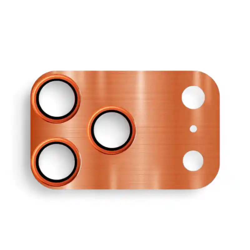 Protector de cámara metalizado color naranja para iPhone 17 Pro con acabado brillante y diseño llamativo que protege eficazmente contra golpes y rayones.