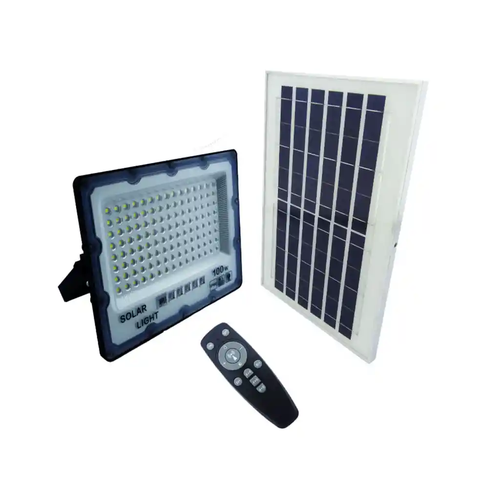 Proyector LED solar de 100 Watt. Equipado con un panel solar y 120 LED brillantes, este proyector ofrece potencia y versatilidad. Controla la luz a distancia con el control remoto, aprovechando la energía solar para crear ambientes cautivadores en cualquier ocasión, producto de calidad en caja.