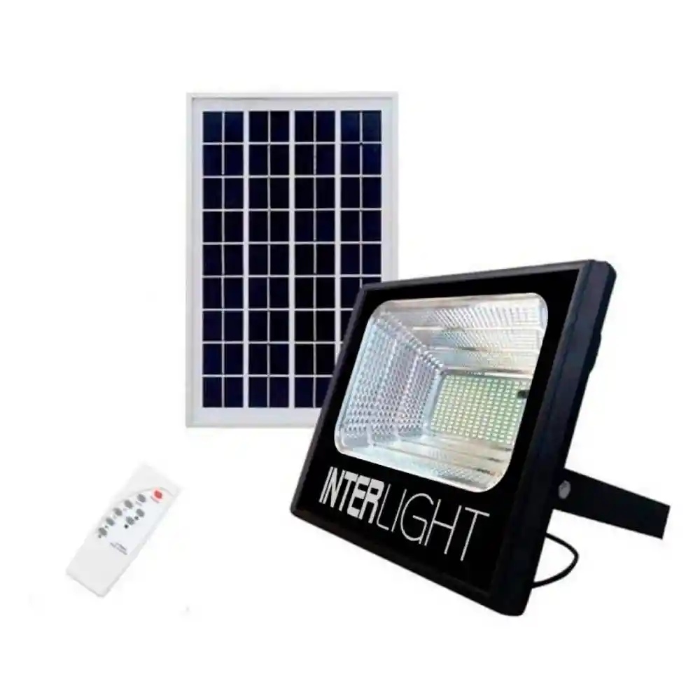 Proyector Exterior LED Solar 40W Interlight. Para uso exterior. Color: Negro. Temperatura de Color: 6000K. Tiempo de uso: 10-12 hrs. Potencia: 40W.