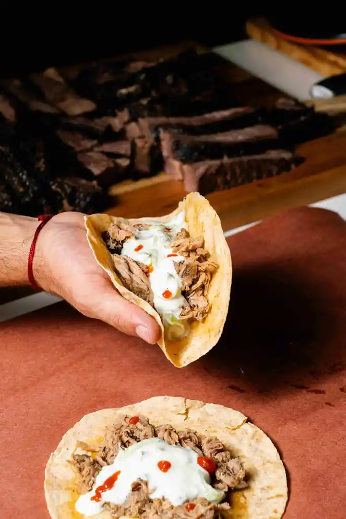 Paleta de cerdo desmenuzada Nuestro pulled pork es adobado con sal y mix de especias para luego ser ahumado lentamente durante 10 horas con maderas de árboles frutales, lo que aporta un toque dulce y aromático inconfundible. La carne de cerdo se deshilacha suavemente al tacto, manteniendo su jugosidad y capturando cada nota del humo frutal. El resultado: un bocado tierno, sabroso y lleno de carácter, ideal para sándwiches, tacos o disfrutar solo, tal como sale del ahumador."