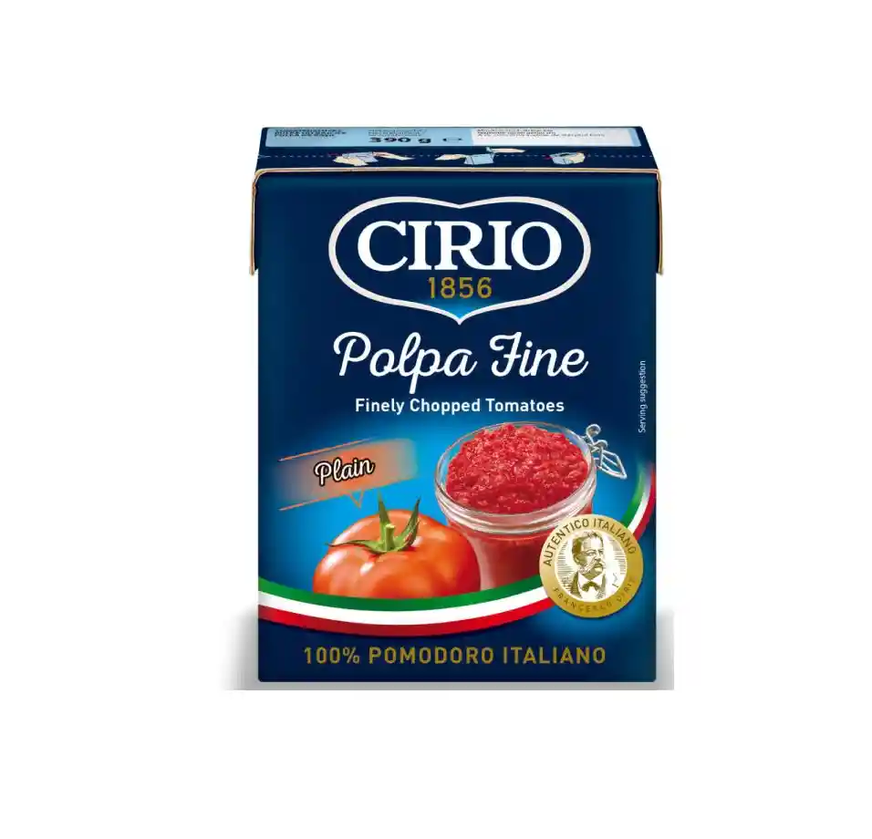 Pulpa fina de tomates italianos natural en un moderno y práctico envase. Son un óptima base para preparar salsas para la pasta y enriquecer los platos. Adecuado para preparar salsas y guisos rápidos, como condimiento o para sazonar brusquettas. Ingredientes principales: PULPA DE TOMATE (65%), TOMATE CONCENTRADO Y OTROS. Hecho en Italia.