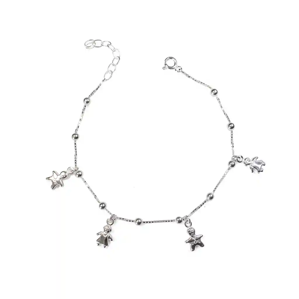 Pulsera 4 Chiches 2 niñas y 2 niños Plata Fina Ley 925 sólida. Calidad garantizada, libre de níquel. Medidas: Largo Total 17cm más 3cm de extensión. Tamaño Chiches 8x7mm. Peso: 3,2gr.