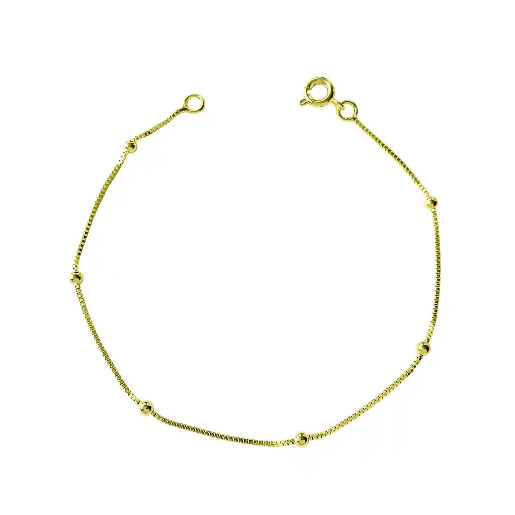 Pulsera 6 Bolitas Veneciana. Un diseño elegante Enchapado en Oro 18K, hipoalergénico y libre de níquel. Perfecta para añadir un toque sofisticado a tu look diario. Luce un estilo único y brillante. Medidas: Largo total 18 cm. Diámetro de cada bolita 2mm. Peso 1 gr.