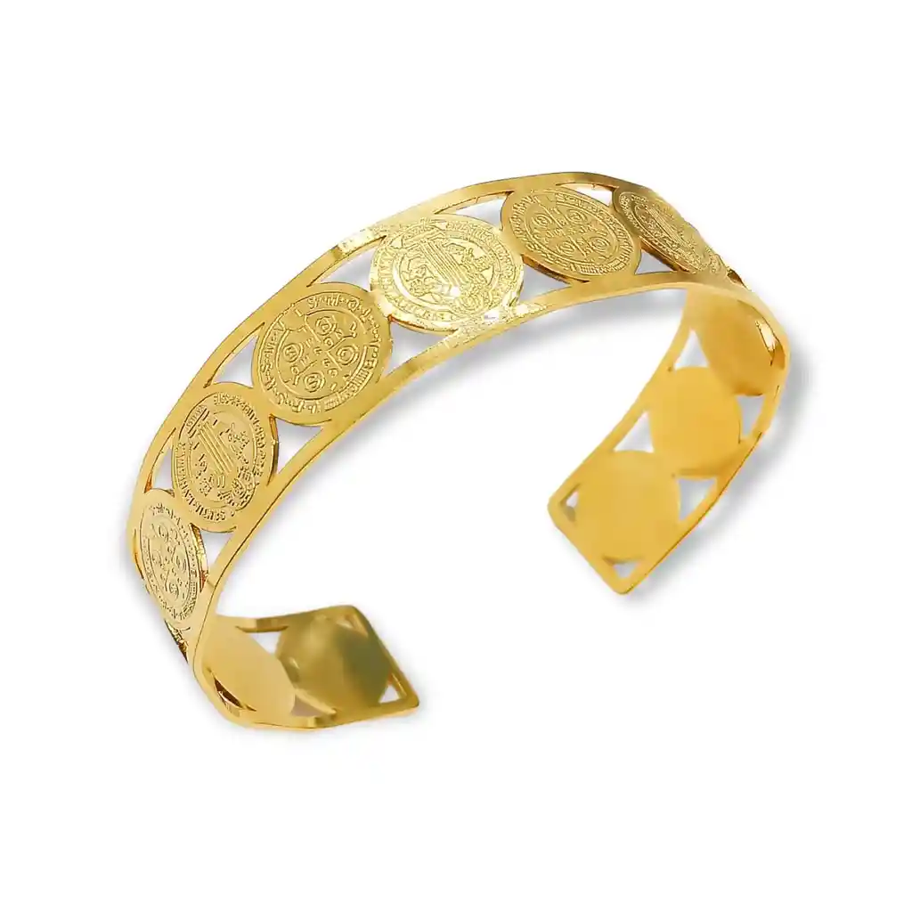 Hermoso brazalete ajustable el cual esta compuesto por unas bellas medallitas de San Benito y esta fabricado en acero inoxidable quirúrgico, bañado en oro. Tiene una belleza sin igual. De seguro sera el regalo perfecto para esa persona especial. Este brazalete puede ajustarse de la talla 16 cm a la talla de 20 cm, siempre cuando tomes en cuenta que por tratarse de una joya, debe tratarse con mucha delicadeza, no forzar su ajuste continuamente pues provocaras desperfectos en su forma. Nuestro hermoso brazalete se entrega en bella cajita de regalo para acompañarte en bellos momentos. (Se envia en bella presentacion para regalo) Ofrecemos joyas únicas que cuentan historias especiales. Contamos con una amplia variedad de joyas de metales preciosos, gemas y arte adaptados a los gustos de nuestros clientes. Además, disponemos de auténticas piedras preciosas de la mejor calidad. Descubre nuestros productos en plata, oro, oro rosa y acero quirúrgico 316L, perfectos para cualquier ocasión. Encuentra el regalo u obsequio perfecto para cumpleaños, aniversarios, San Valentín, día de las madres, día del padre, graduaciones, viajeros, bodas y más. ¡Regalos originales y obsequios para todo tipo de fanáticos! Una joya o accesorio es el obsequio perfecto pues siempre añade un toque de elegancia a tu atuendo y look.