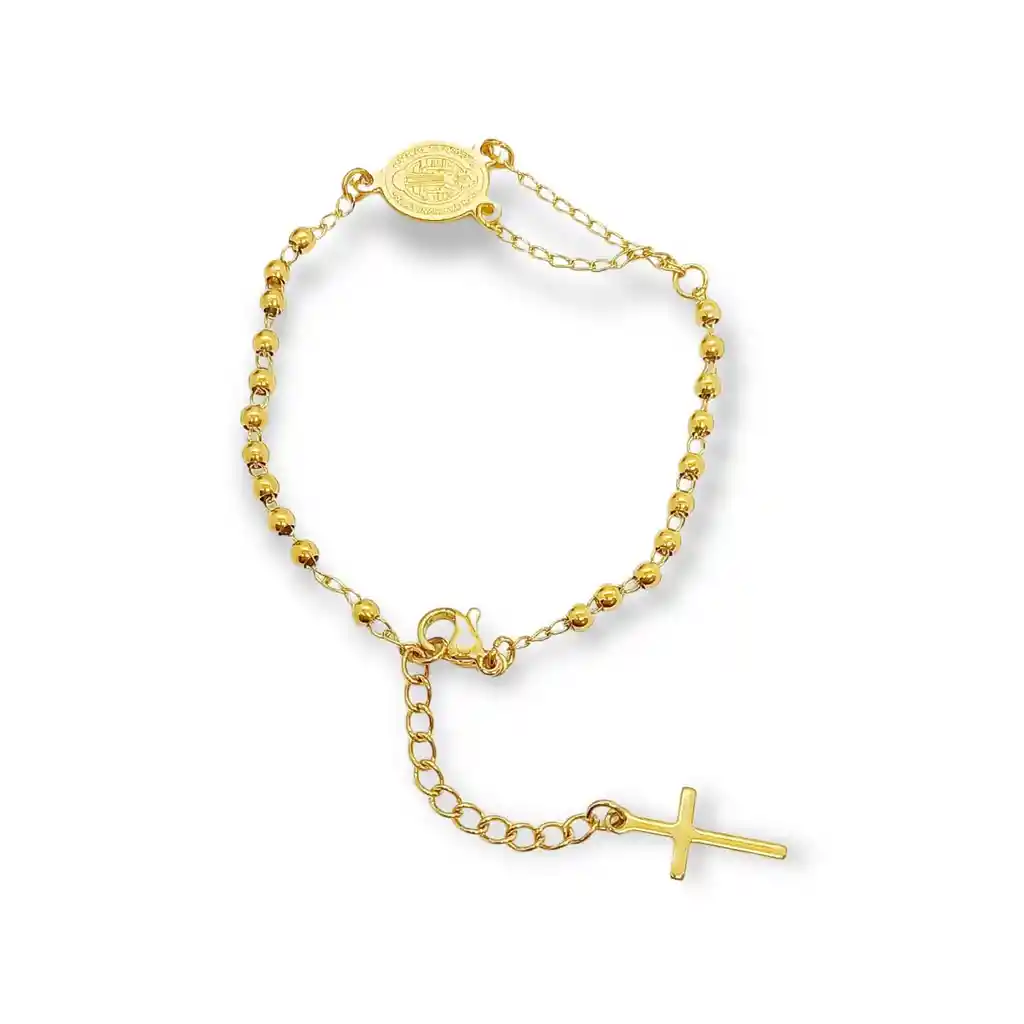 Hermosa pulsera en forma de rosario con dije de protección de la Medalla de San Benito y Cruz colgante, con hermoso acabado en un resistente y brillante chapado en oro de 18kl Material: Chapado en oro 18kl Dimensiones: ajustable de la talla 16 cm a la talla de 20 cm. Peso aprox: 9gr (Se envía con bella caja de regalo)
