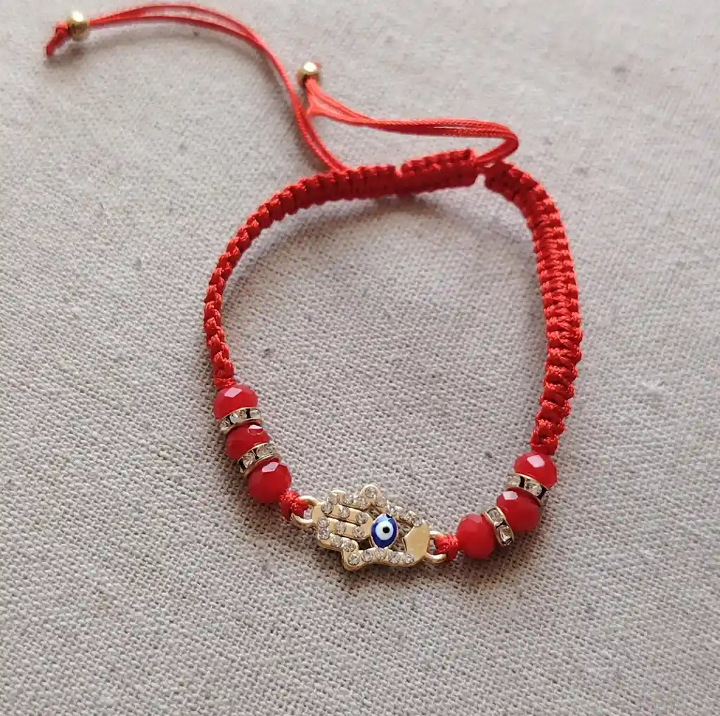 Pulsera de hilo rojo con dije central de protección y detalles brillantes, ideal para llevar como amuleto y accesorio diario.