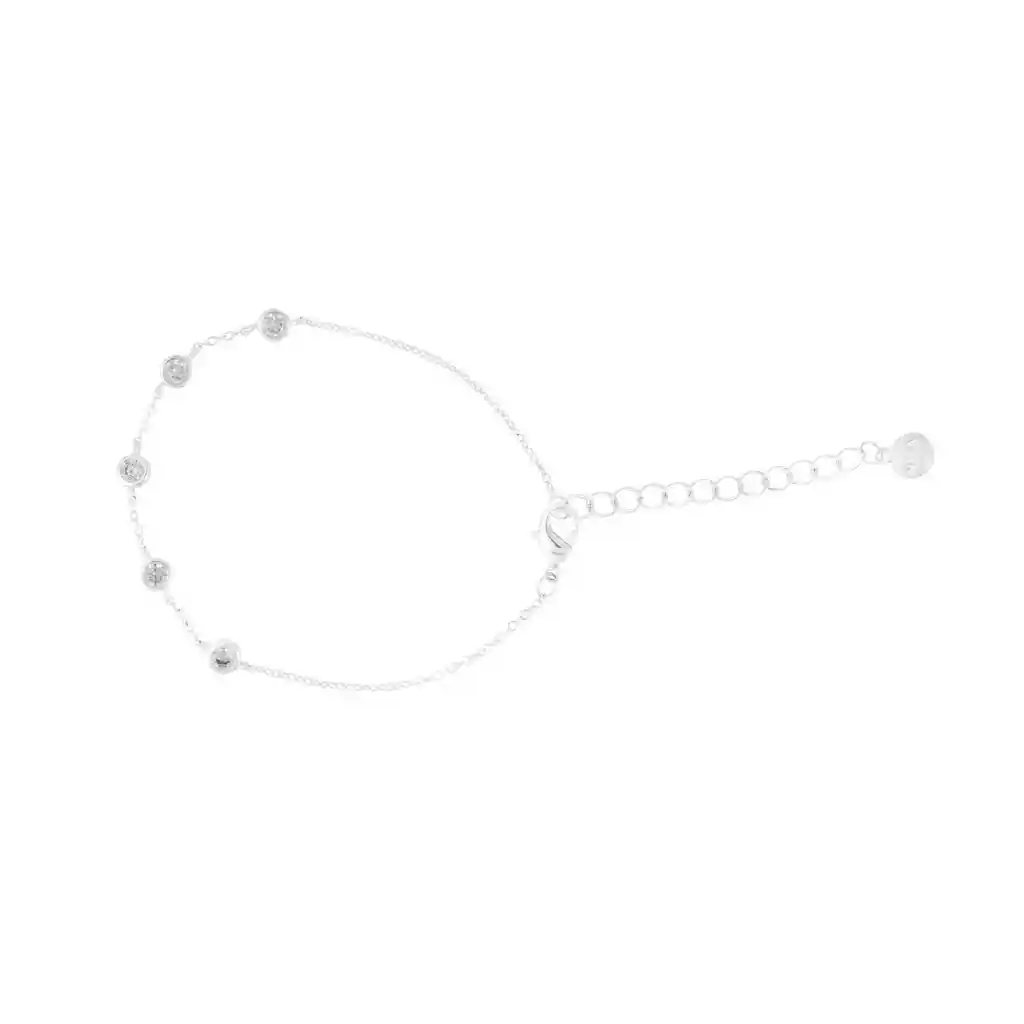Sin duda esta pulsera se convertirá en una de tus favoritas. Esta fabricada en plata 925 y la cadena esta compuesta por 5 zircones blancos y redondos. La pulsera además es ajustable. Medida: 24mm. ¡Todas nuestras joyas vienen con un packaging especial que te enamorará!