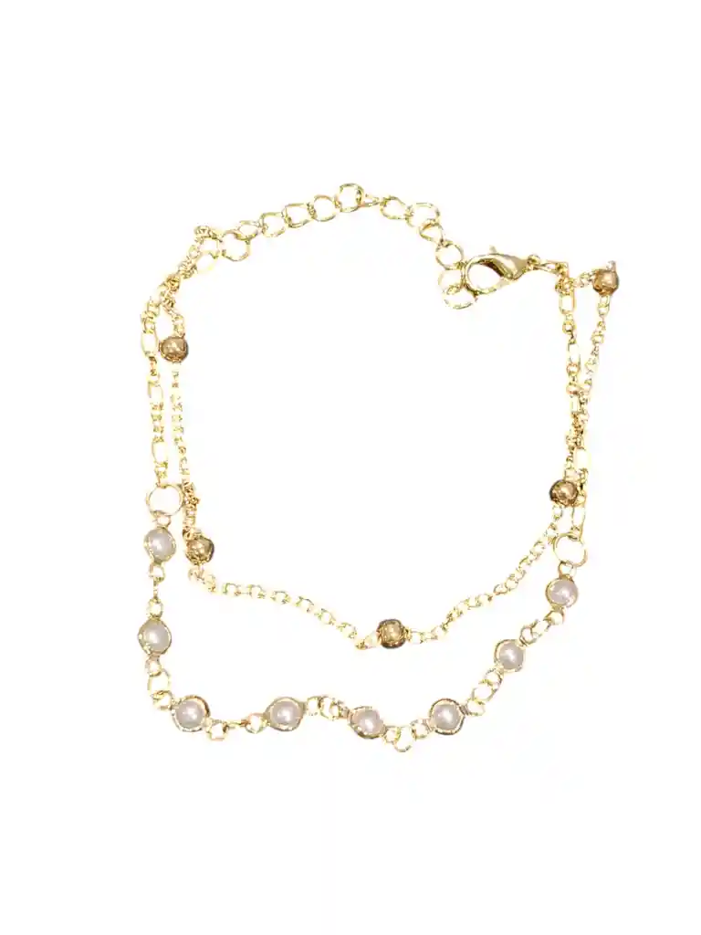 Pulsera de cadena doble bañadas en oro, con delicados detalles de pequeñas perlas y esferas metalizadas que aportan textura y luminosidad. Su diseño armoniza elegancia y modernidad, logrando una pieza sofisticada y versátil. Ideales para usar solas o en combinación, realzan cualquier look con un toque femenino y refinado.