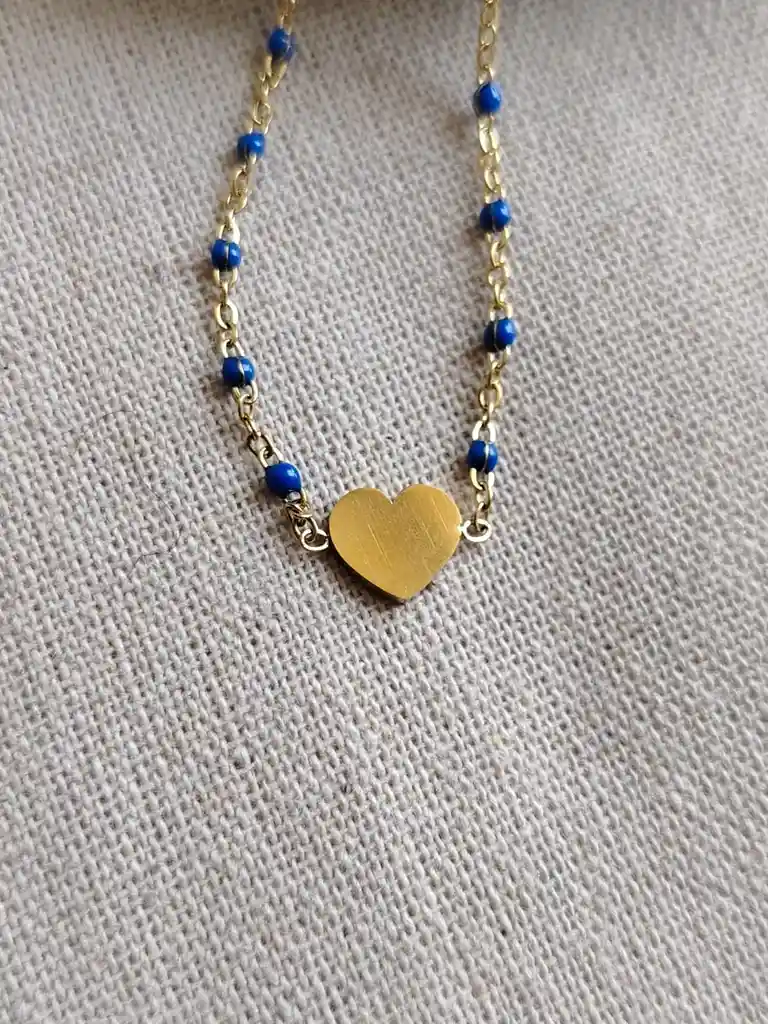 Pulsera bañada en oro con delicadas cuentas azules y un pequeño dije de corazón al centro. Femenina, sutil y perfecta para el uso diario.