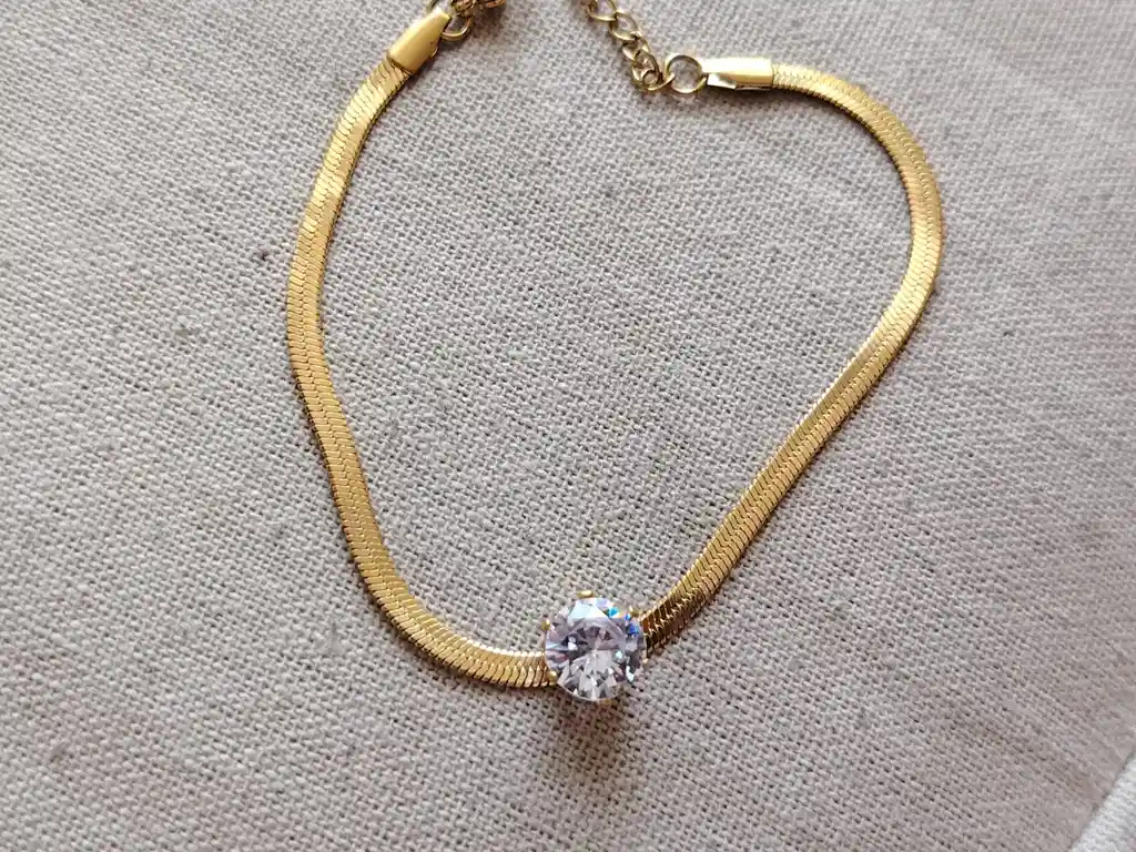 Pulsera bañada en oro con diseño tipo serpiente y cristal central brillante que aporta un toque de luz y sofisticación.