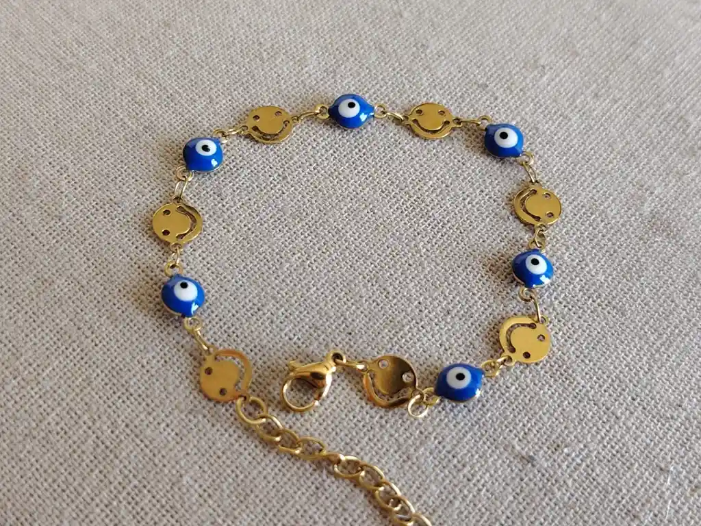 Pulsera bañada en oro con ojitos azules y dijes de carita, ideal para atraer buena vibra y estilo.