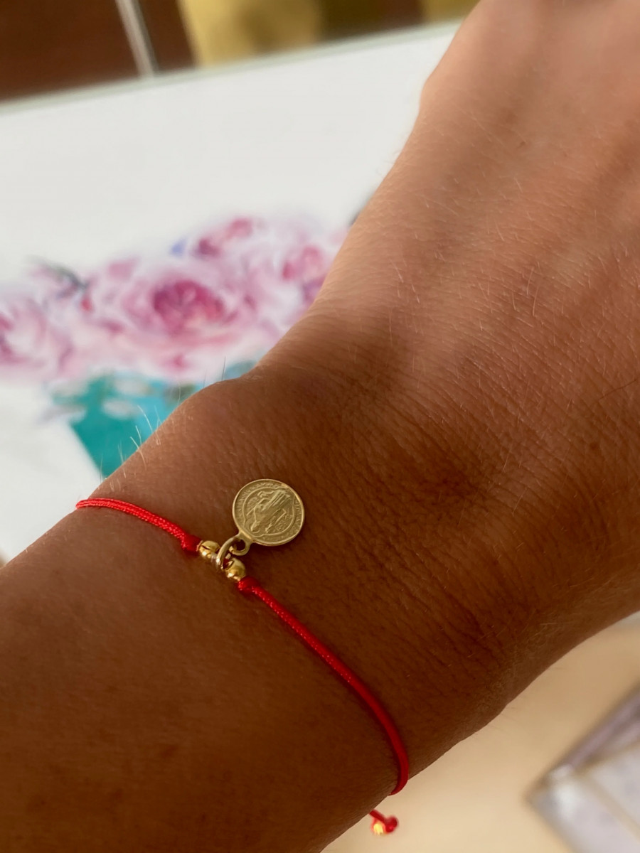 Pulsera de hilo rojo con nudo corredizo de largo ajustable, medalla San Benito de 9 mm de diámetro enchapada en oro 18K libre de níquel. Hipoalergénic