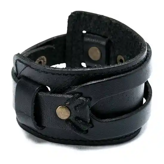 Pulsera Tipo Brazalete Ancho en Cuero Color Negro. Detalles y Broche a Presión en Bronce. Cuenta Con Dos Medidas de Ajuste. 18 21 cm (Diámetro) Ajustable